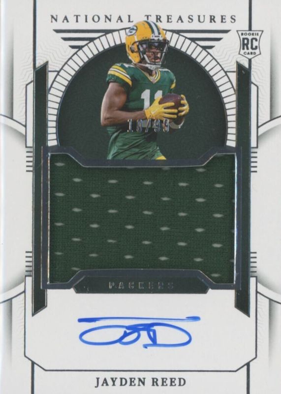 This card is 1 of 38 Jayden Reed's card variations in the 2023 National Treasures set being tracked by Sports Card Investor, including Rookie Material Signatures - Green Jersey Number (/11), Rookie Patch Auto - Green Jersey Number (/11), Crossover Rookie Patch Autographs /99, Rookie Material Signatures /99, and Rookie Patch Auto - Purple /49.