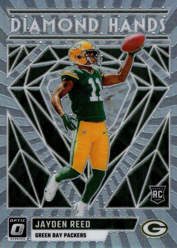 The Jayden Reed 2023 Optic #DH-JR Diamond Hands Rookie card in Raw condition has moved up $1.00 (+101%) in the last 30 days and was last sold for $1.99 .