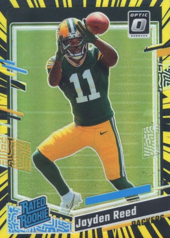 This card is 1 of 74 Jayden Reed's card variations in the 2023 Optic set being tracked by Sports Card Investor, including Base, Blue Hyper, Blue Scope, Green Hyper, and Green Velocity.