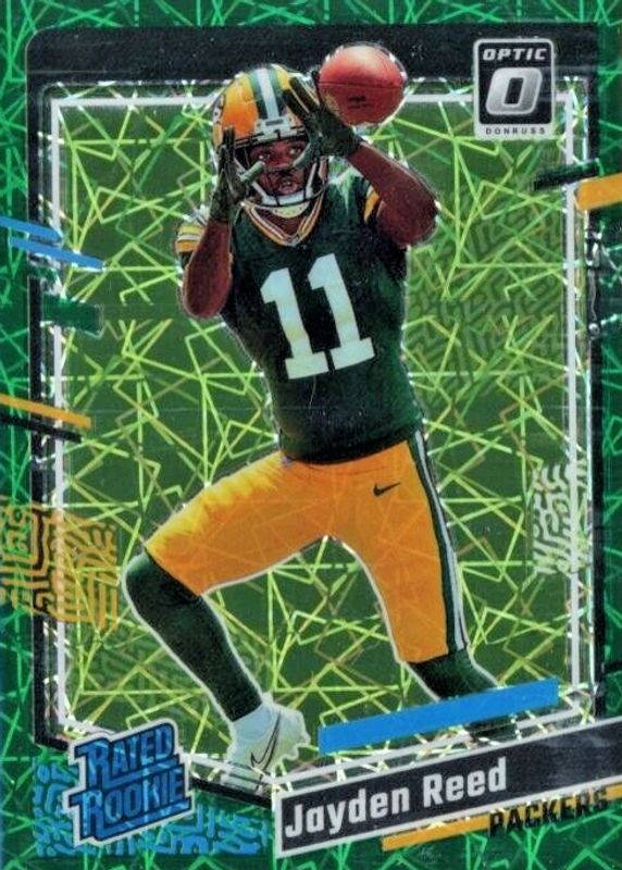 The Jayden Reed 2023 Optic #239 Green Velocity Rookie card in Raw condition has moved down -$0.09 (-6.7%) in the last 30 days and was last sold for $1.25 .