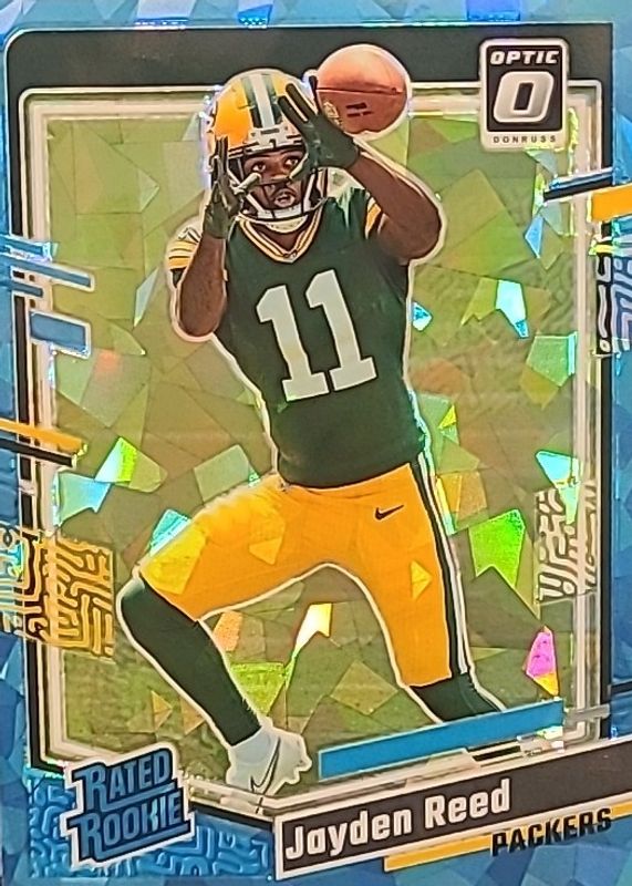 This card is 1 of 74 Jayden Reed's card variations in the 2023 Optic set being tracked by Sports Card Investor, including Base, Blue Hyper, Blue Scope, Green Hyper, and Green Velocity.