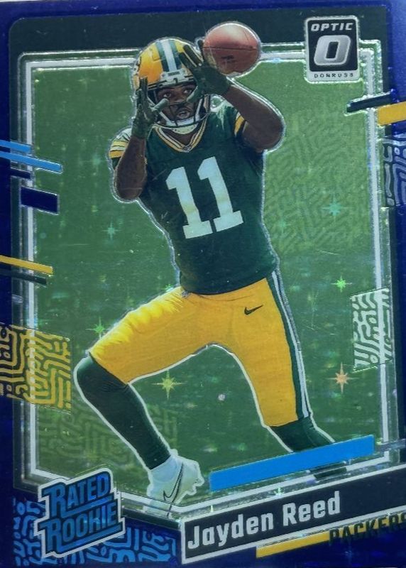 This card is 1 of 74 Jayden Reed's card variations in the 2023 Optic set being tracked by Sports Card Investor, including Base, Blue Hyper, Blue Scope, Green Hyper, and Green Velocity.