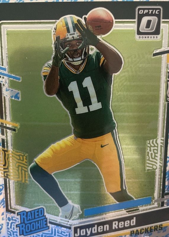 This card is 1 of 74 Jayden Reed's card variations in the 2023 Optic set being tracked by Sports Card Investor, including Base, Blue Hyper, Blue Scope, Green Hyper, and Green Velocity.