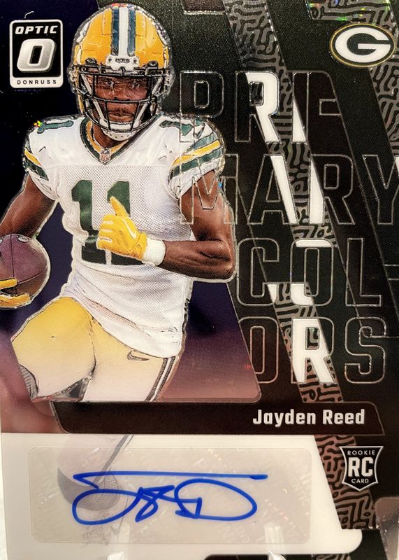 The Jayden Reed 2023 Optic #12 Rookie Primary Colors Autographs - Purple Stars /25 card in Raw condition has not changed in price in the last 30 days and was last sold for $45.00 .