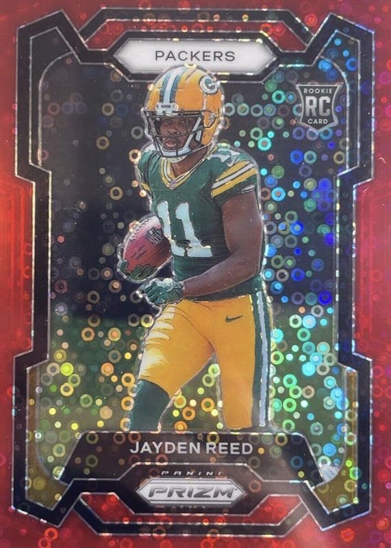 This card is 1 of 82 Jayden Reed's card variations in the 2023 Prizm set being tracked by Sports Card Investor, including Base, Disco, Green, Green Ice, and Green Wave.