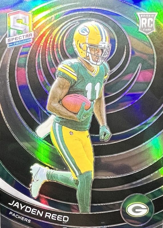 This card is 1 of 39 Jayden Reed's card variations in the 2023 Spectra set being tracked by Sports Card Investor, including Base, Silver, Celestial /99, Hyper /75, and Interstellar /60.