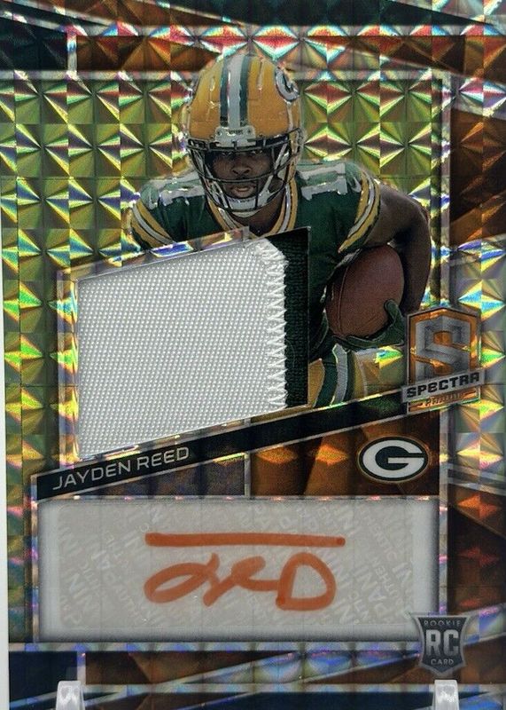 The Jayden Reed 2023 Spectra #218 Rookie Patch Auto - Neon Orange /15 card in Raw condition has not changed in price in the last 30 days and was last sold for $55.00 .