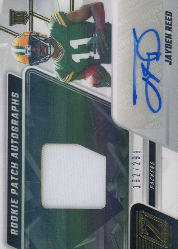 The Jayden Reed 2023 Zenith #218 Rookie Patch Auto /299 card in Raw condition has moved down -$7.49 (-28.8%) in the last 30 days and was last sold for $18.50 .