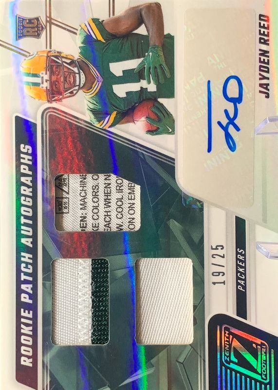 This card is 1 of 16 Jayden Reed's card variations in the 2023 Zenith set being tracked by Sports Card Investor, including Rookie Wave, Rookie Wave - Sparkle, Rookie Patch Auto /299, Rookie Patch Auto - Copper /50, and Rookie Patch Auto - Sparkle /50.