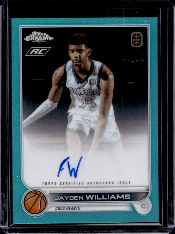 The Jayden Williams 2022 Topps Chrome OTE Overtime Elite #CA-JW2 Chrome Autographs Aqua Refractor /99 Rookie card is 1 of 163 Jayden Williams' card variations in the 2022 Topps Chrome OTE Overtime Elite set being tracked by Sports Card Investor, including #84 Aqua OTE, #13 Aqua OTE, #21 Aqua OTE, #29 Aqua OTE, and #84 RayWave OTE.