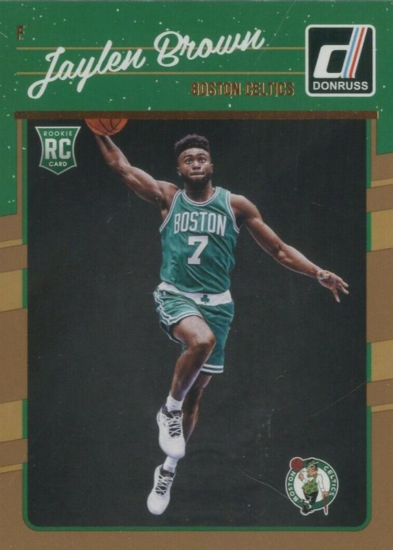 The Jaylen Brown 2016 Donruss #153 Base Rookie card in Raw condition has moved down -$1.05 (-21.0%) in the last 30 days and was last sold for $3.95 .