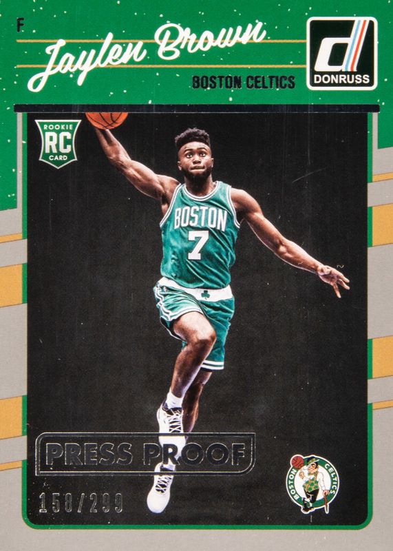 The Jaylen Brown 2016 Donruss #153 Press Proof Silver /299 Rookie card in Raw condition has not changed in price in the last 30 days and was last sold for $20.50 .