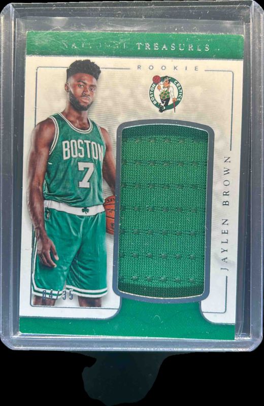 The Jaylen Brown 2016 National Treasures #5 Rookie Jumbo - Materials /35 card is 1 of 33 Jaylen Brown's card variations in the 2016 National Treasures set being tracked by Sports Card Investor, including #154 Base /99, #104 Base /99, #104 Rookie Patch Auto /99, #104 Rookie Patch Auto - Gold /10, and #104 Rookie Patch Auto - Emerald /5.