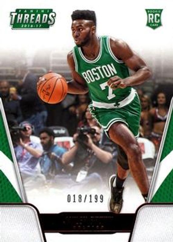 The Jaylen Brown 2016 Threads #176 Century Proof Red /199 Rookie card is 1 of 24 Jaylen Brown's card variations in the 2016 Threads set being tracked by Sports Card Investor, including #176 Base, #205 Base, #246 Base, #270 Base, and #176 Century Proof Dazzle.