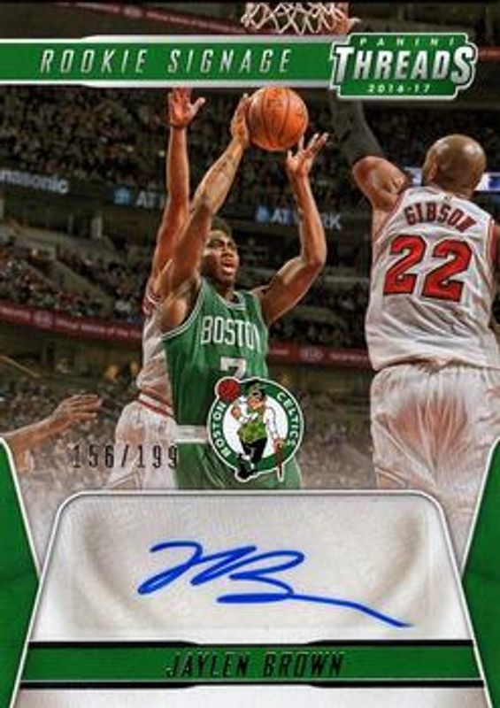 The Jaylen Brown 2016 Threads #2 Rookie Signage /199 card is 1 of 24 Jaylen Brown's card variations in the 2016 Threads set being tracked by Sports Card Investor, including #176 Base, #205 Base, #246 Base, #270 Base, and #176 Century Proof Dazzle.