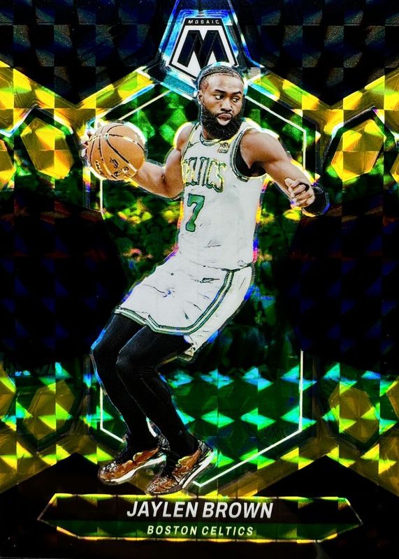 This card is 1 of 16 Jaylen Brown's card variations in the 2023 Mosaic set being tracked by Sports Card Investor, including Choice Peacock /(SSP), Genesis /(SSP), Glitter /(SSP), White Sparkle /(SSP), and Fast Break Gold /10.