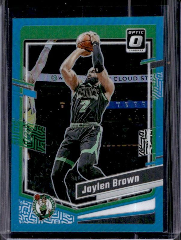 The Jaylen Brown 2023 Optic #113 Aqua /249 card is 1 of 69 Jaylen Brown's card variations in the 2023 Optic set being tracked by Sports Card Investor, including Base, Blue Velocity, Checkerboard, Choice Red & Green, and Fast Break.