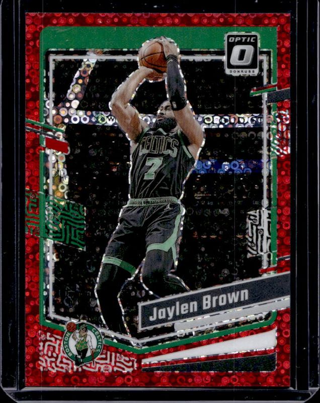 The Jaylen Brown 2023 Optic #113 Fast Break Red /75 card is 1 of 69 Jaylen Brown's card variations in the 2023 Optic set being tracked by Sports Card Investor, including Base, Blue Velocity, Checkerboard, Choice Red & Green, and Fast Break.