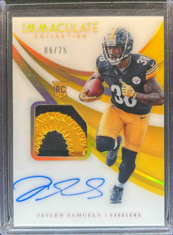 The Jaylen Samuels 2018 Immaculate #133 Gold /25 Rookie card is 1 of 46 Jaylen Samuels' card variations in the 2018 Immaculate set being tracked by Sports Card Investor, including Base /99, Emerald /14, Immaculate Players Collection Autographs /99, Immaculate Rookie Eye Black - Jersey /99, and Immaculate Signatures Patches Rookie /99.