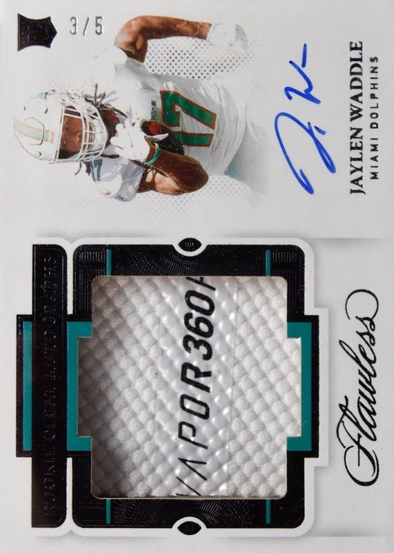 The Jaylen Waddle 2021 Flawless #RCA-JWA Rookie Cleat Autographs /5 card in Raw condition has not changed in price in the last 30 days and was last sold for $360.00 .