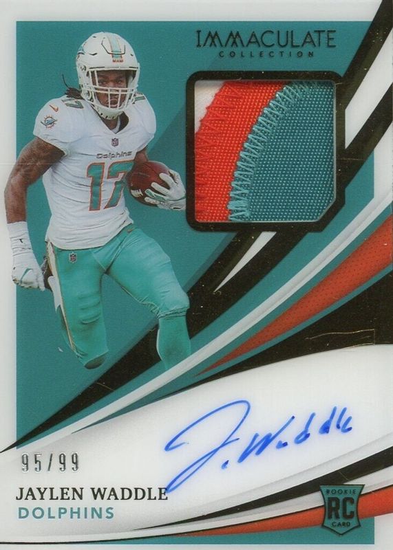 This card is 1 of 26 Jaylen Waddle's card variations in the 2021 Immaculate set being tracked by Sports Card Investor, including Immaculate Introductions Autographs (/49), Immaculate Numbers Rookie Patch Autographs (/17), Immaculate Rookie Eye Black Jersey Autographs (/99), Immaculate Rookie Eye Black Jersey Autographs - Gold (/25), and Immaculate Rookie Shadowbox Signatures (/75).