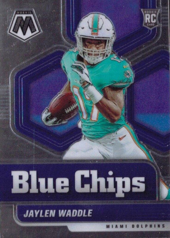 The Jaylen Waddle 2021 Mosaic #8 Blue Chips Rookie card in Raw condition has not changed in price in the last 30 days and was last sold for $0.99 .