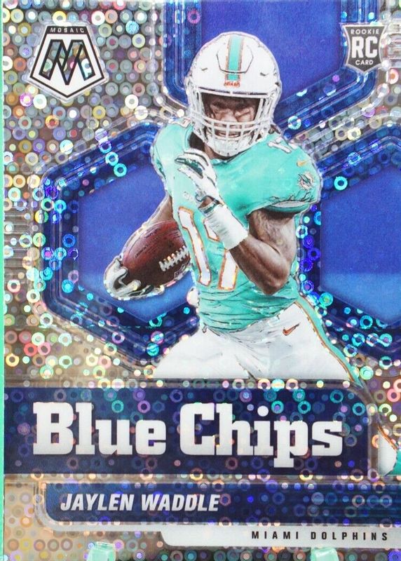 The Jaylen Waddle 2021 Mosaic #8 Blue Chips - No Huddle Rookie card in Raw condition has not changed in price in the last 30 days and was last sold for $4.25 .