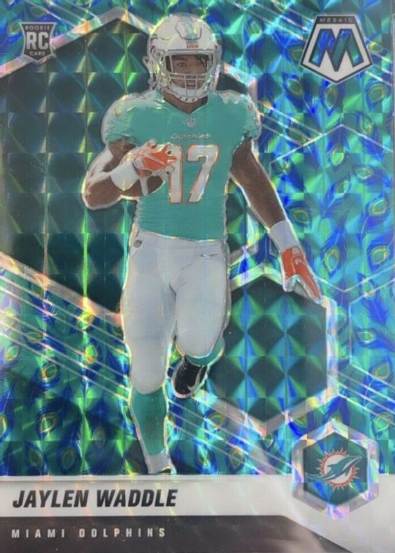 The Jaylen Waddle 2021 Mosaic #308 Choice Peacock /(SSP) Rookie card in Raw condition has not changed in price in the last 30 days and was last sold for $152.50 .
