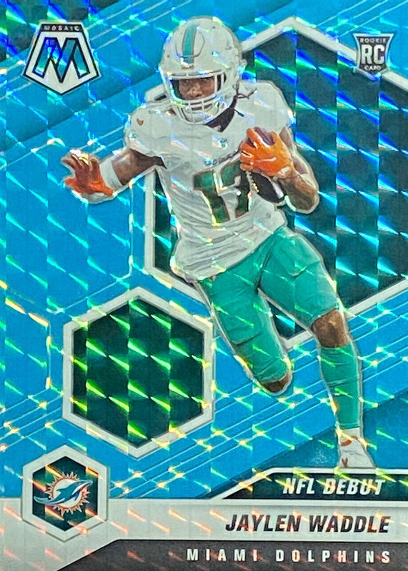 The Jaylen Waddle 2021 Mosaic #248 NFL Debut - Blue Fluorescent /15 Rookie card in Raw condition has not changed in price in the last 30 days and was last sold for $78.00 .
