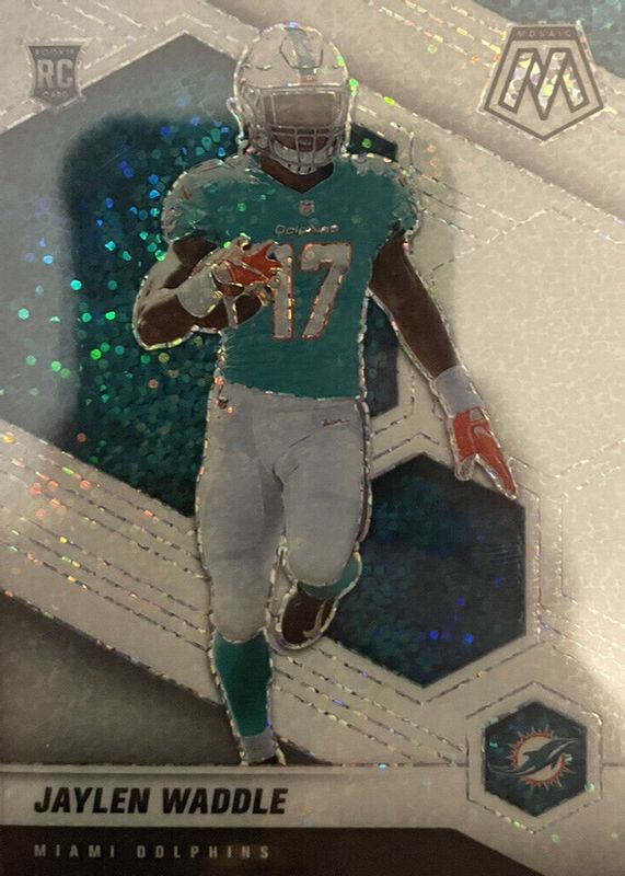 The Jaylen Waddle 2021 Mosaic #308 White Sparkle /(SSP) Rookie card in Raw condition has not changed in price in the last 30 days.