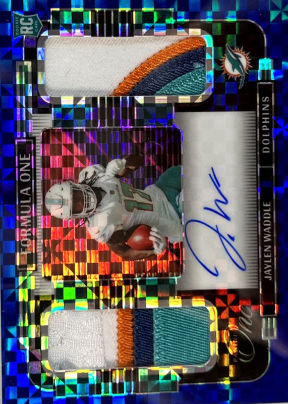 The Jaylen Waddle 2021 One #377 Formula One Autographs - Blue (/35) Rookie card in Raw condition has not changed in price in the last 30 days and was last sold for $218.50 .
