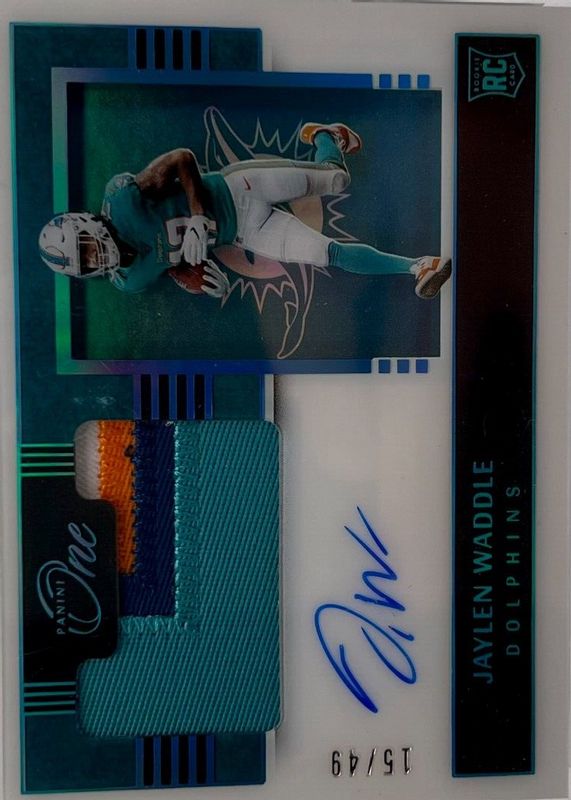 The Jaylen Waddle 2021 One #123 Premium Rookie Patch Autographs - Blue (/49) card in Raw condition has not changed in price in the last 30 days and was last sold for $137.50 .