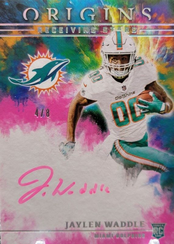 The Jaylen Waddle 2021 Origins #RES-JW Receiving Stars Signatures - Pink /8 Rookie card in Raw condition has not changed in price in the last 30 days and was last sold for $152.50 .