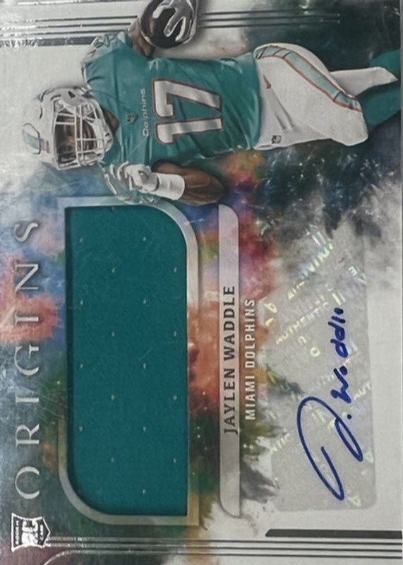 The Jaylen Waddle 2021 Origins #163 Rookie Jumbo Jersey Autographs card in Raw condition has not changed in price in the last 30 days and was last sold for $33.75 .