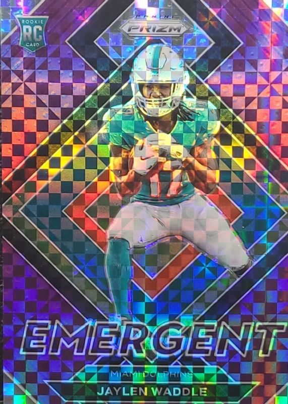 The Jaylen Waddle 2021 Prizm #E-8 Emergent - Purple Power /49 Rookie card in Raw condition has not changed in price in the last 30 days and was last sold for $43.00 .