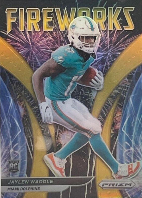 The Jaylen Waddle 2021 Prizm #F-5 Fireworks - Gold /10 Rookie card in Raw condition has not changed in price in the last 30 days and was last sold for $335.00 .