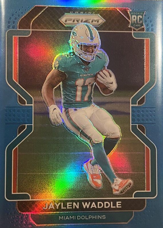 The Jaylen Waddle 2021 Prizm #338 Light Blue Rookie card in Raw condition has moved up $10.51 (+150%) in the last 30 days and was last sold for $17.50 .