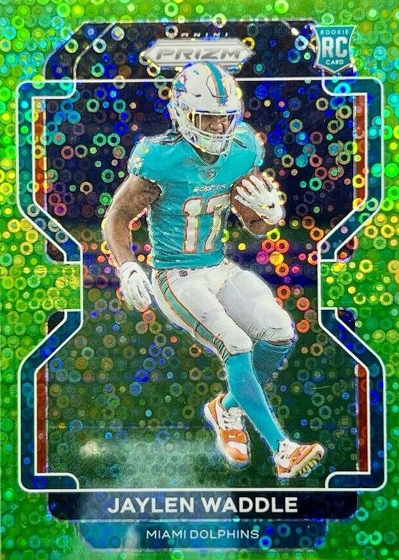 This card is 1 of 81 Jaylen Waddle's card variations in the 2021 Prizm set being tracked by Sports Card Investor, including Base, Disco, Green, Green Ice, and Lazer.