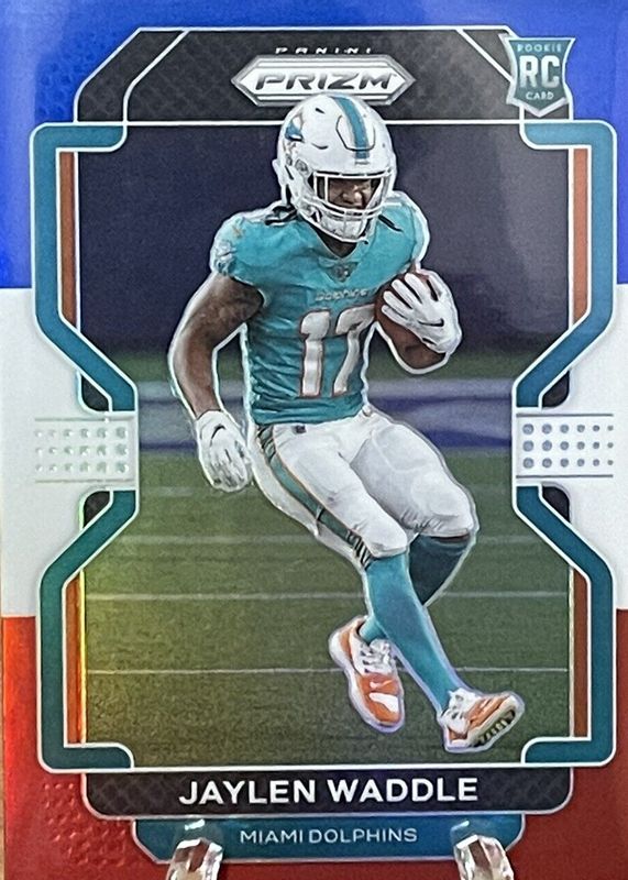 The Jaylen Waddle 2021 Prizm #338 Red White Blue Rookie card in Raw condition has moved down -$1.06 (-28.3%) in the last 30 days and was last sold for $2.69 .