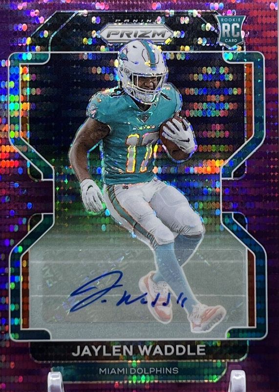 The Jaylen Waddle 2021 Prizm #338 Rookie Autographs - Purple Pulsar card in Raw condition has not changed in price in the last 30 days and was last sold for $169.99 .