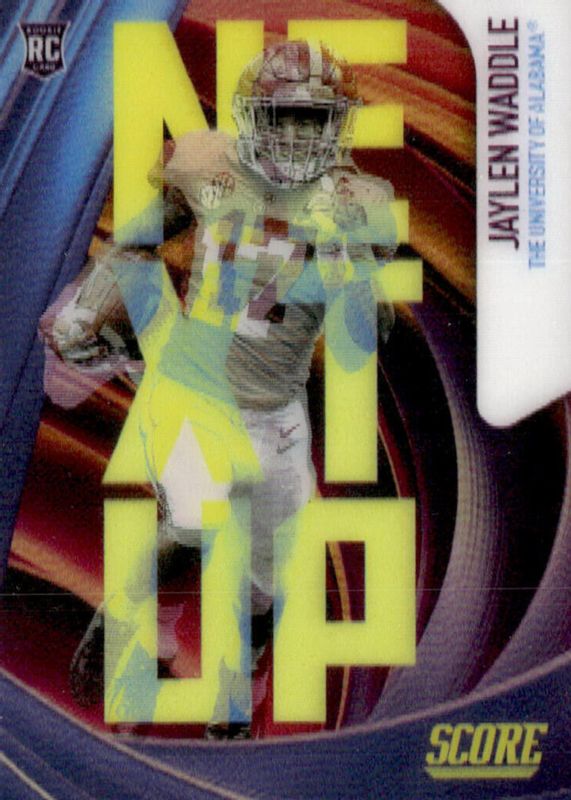 The Jaylen Waddle 2021 Score #NU8 Next Up /(SSP) Rookie card in Raw condition has not changed in price in the last 30 days and was last sold for $17.50 .