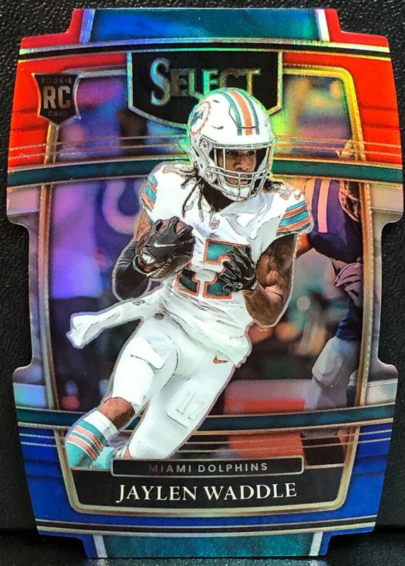 The Jaylen Waddle 2021 Select #48 Concourse Red & Blue Die-Cut Rookie card in Raw condition has moved up $2.01 (+203%) in the last 30 days and was last sold for $3.00 .