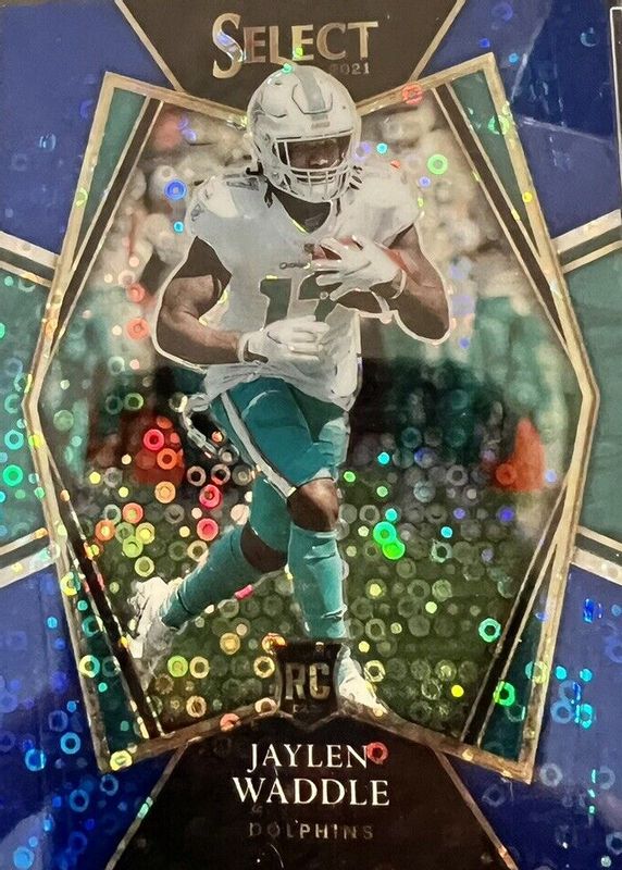 This card is 1 of 169 Jaylen Waddle's card variations in the 2021 Select set being tracked by Sports Card Investor, including Club Level, Concourse, Field Level, Premier Level, and Club Level Black & Gold Die-Cut.