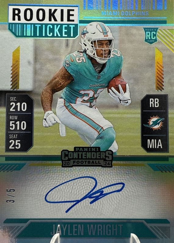 The Jaylen Wright 2024 Contenders #132 Rookie Ticket Auto - Goal Line Ticket /5 card in Raw condition has not changed in price in the last 30 days and was last sold for $76.00 .