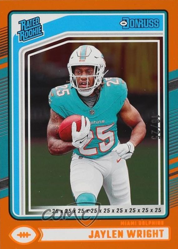 The Jaylen Wright 2024 Donruss #344 Jersey Number (/25) Rookie card in Raw condition has not changed in price in the last 30 days and was last sold for $1.36 .