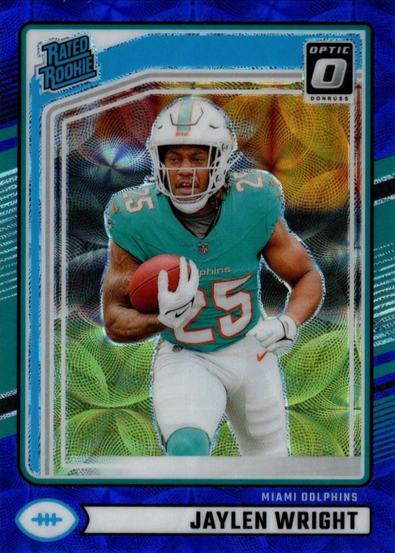 The Jaylen Wright 2024 Donruss #344 Optic Preview - Blue Scope Rookie card in Raw condition has not changed in price in the last 30 days and was last sold for $0.99 .