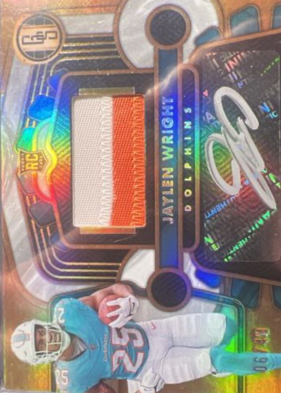 The Jaylen Wright 2024 Gold Standard #233 Rookie Jersey Autographs - White Gold /49 card in Raw condition has not changed in price in the last 30 days and was last sold for $23.50 .