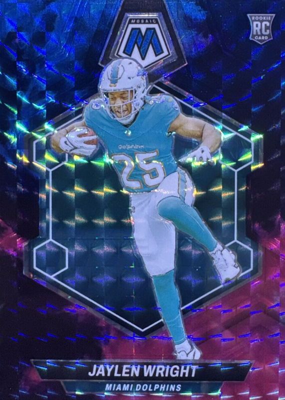 The Jaylen Wright 2024 Mosaic #383 Choice Nebula /1 Rookie card in Raw condition has not changed in price in the last 30 days and was last sold for $585.00 .