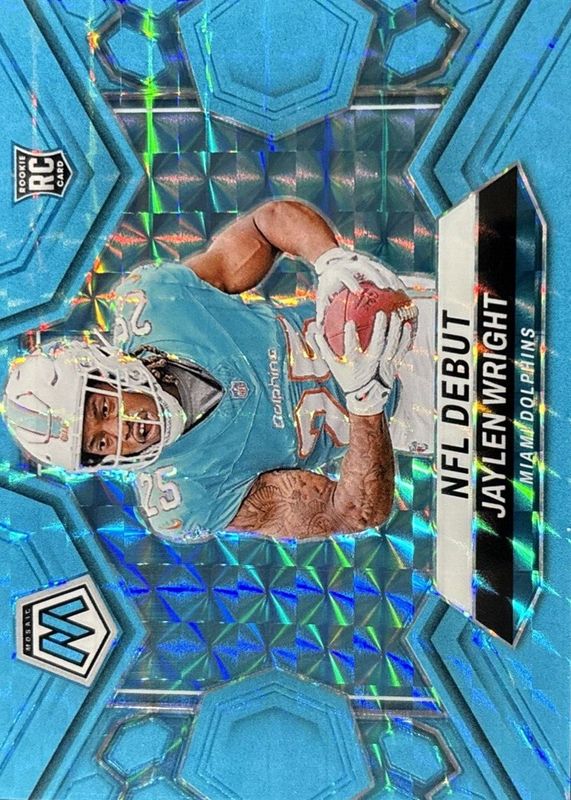 The Jaylen Wright 2024 Mosaic #280 NFL Debut - Blue Fluorescent /15 Rookie card in Raw condition has not changed in price in the last 30 days and was last sold for $51.99 .