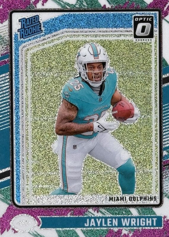 The Jaylen Wright 2024 Optic #249 Jazz /(SSP) Rookie card in Raw condition has not changed in price in the last 30 days and was last sold for $5.75 .